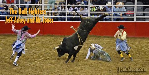 Bull Fighters Travis Adams (R) and Cody Webster (L) risk themselves to protect bull rider Jeff Askey as Mr. Jones exhibits his ornery nature.