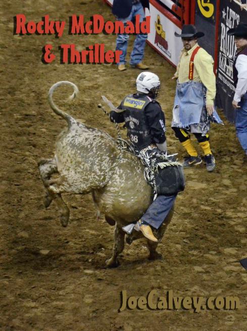Rocky McDonald is from Chihuahua, Mexico. He's riding what appears to be half a bull but be assured Thriller is all bull and then some.