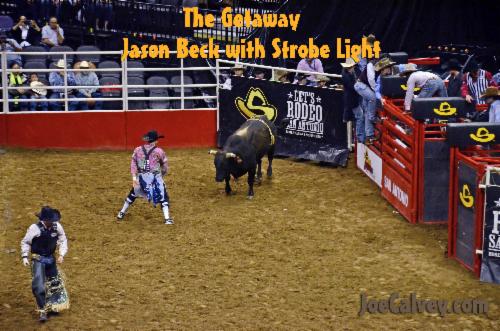 Strobe Light doesn't hesitate too long before charging forward then head for the livestock pens as cowboy Jason Beck walks off to the applause of an appreciative crowd.