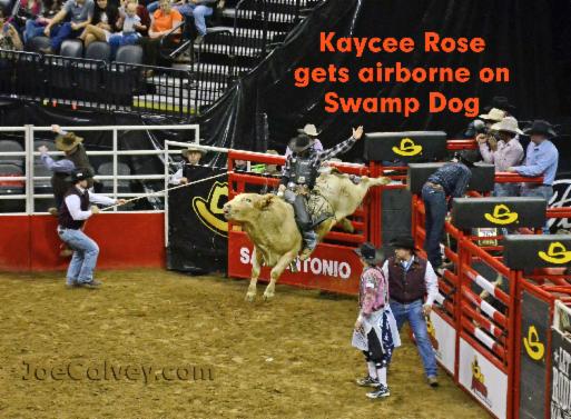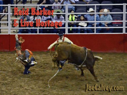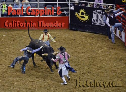 No, this ain't Prison Rodeo Poker, bull rider Paul Cappini is momentarily hung up on his rigging.
