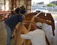 "OK, Joey, we are going to grab some of these boards here and start getting some transoms built." Darrell called out as Burt and Beverly began sanding their project. Before we could react Darrell began pulling out a huge 20 foot long mahogany board that took several of us to lift up. "OK, get me three pieces 36" inches long" he continued before heading off to check on something in one of the storage units.