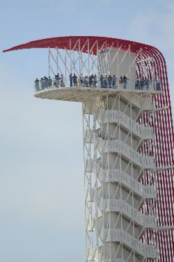 The red and white observation tower at the Circuit of The Americas (COTA) appeared out of the Central Texas farm land east of Austin like a cobra with it’s hood extended. This architectural gem of a platform with weekend public access makes a trip to COTA worth while in it’s own right. Unless, like me, you don’t enjoy peeking off the edge of tall buildings. Nonetheless, I took the elevator to the top of the 251 foot tower. At the edge of the observation deck the strong warm breeze coming in from the south barely moved my hair but that didn’t stop me from putting a death grip on the railing while keeping my legs bow legged flexed least I be blown off. The partial glass floor and sides allowed some clearly deranged MotoGP fans to lie flat while taking "selfies" with the red, white and blue track below them. Oh, yes, the view of the track, downtown Austin and the Texas countryside is awesome.