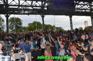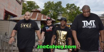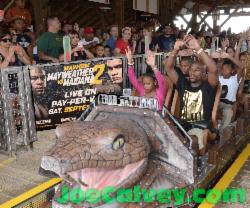 This shot of Floyd TMT Mayweather, Miami Heat fan surrendering in Spurs country you will not see anywhere else. This was part of a promotional tour to hype his upcoming fight against Marcos Maidana. The title of the rematch with Maidana is Mayhem. The mayhem started on the small Fiesta Texas platform alongside the roller coaster track. The crowd on the opposite side should have been held back and the media placed there. As it was one of Mayweather's daughters was almost crushed against the railing, a park empolyee was shouting not to push her onto the tracks as the ride launched. Poor planning by Fiesta Texas staff was obvious as Express News boxing writer John Whisler, the Time Warner News cameraman and the camera woman for Azteca America were not allowed into this area.